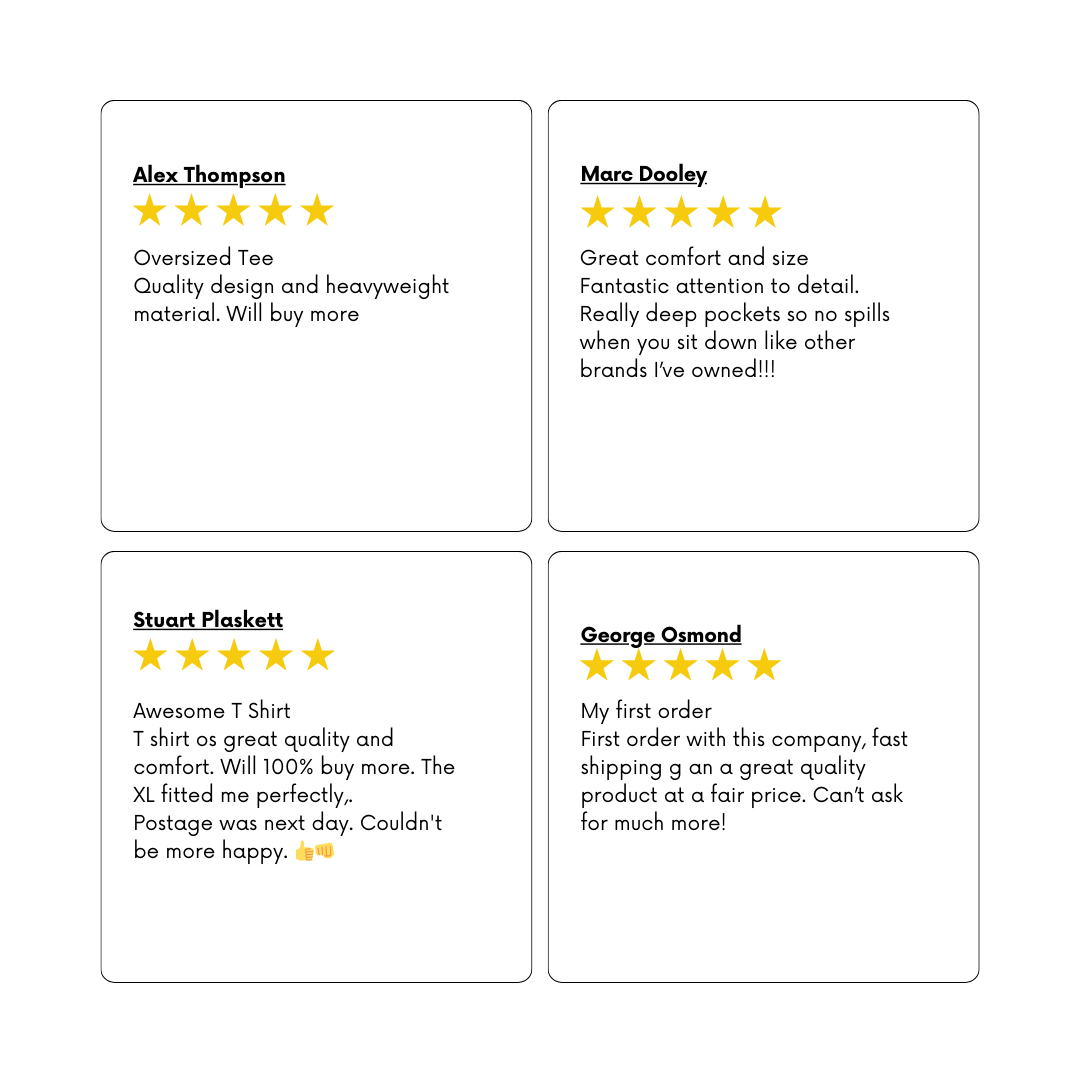 Pay for what you get. Quality product, fast dispatch and packaged perfectly. As someone 6ft6 and 110kg, the oversize tshirt I purchased was perfect. Recommended to all